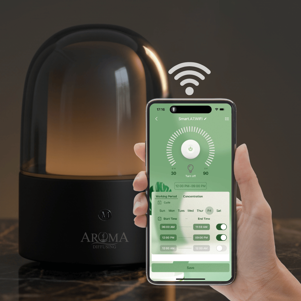 Bedien je geurbeleving rechtstreeks vanaf je telefoon! Met de intuïtieve app kun je de intensiteit aanpassen, aangepaste schema's instellen en zelfs werkingsuren programmeren.